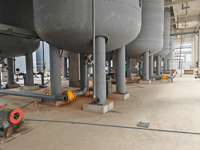 此外,硫化尾氣風(fēng)機已經(jīng)順利就位,并正在加緊安裝。風(fēng)機的安裝過(guò)程涉及精確的調試和校準工作,施工人員根據設計要求,對風(fēng)機的水平度、垂直度等關(guān)鍵參數進(jìn)行嚴格控制,以確保風(fēng)機能夠正常運行。 罐體制作情況 多硫化儲罐、三效工藝水儲罐、火堿儲罐和中和水儲罐等關(guān)鍵設備已經(jīng)制作完成。在設備制作過(guò)程中,公司嚴格按照相關(guān)的質(zhì)量標準和設計規范進(jìn)行生產(chǎn)。選用了優(yōu)質(zhì)的鋼材作為原材料,經(jīng)過(guò)下料、焊接、成型等多道工序,確保了罐體的強度和密封性。 精制、水洗、打漿、多硫化工序 精制、水洗、打漿、多硫化工序相關(guān)的管道和閥門(mén)正在緊鑼密鼓地進(jìn)行安裝。在管道安裝過(guò)程中,嚴格按照工藝流程進(jìn)行布置,確保物料流動(dòng)順暢。同時(shí),對閥門(mén)進(jìn)行嚴格的質(zhì)量檢驗和調試,保證閥門(mén)的開(kāi)閉靈活、密封性能良好。目前已完成大部分管道和閥門(mén)的基礎安裝工作。